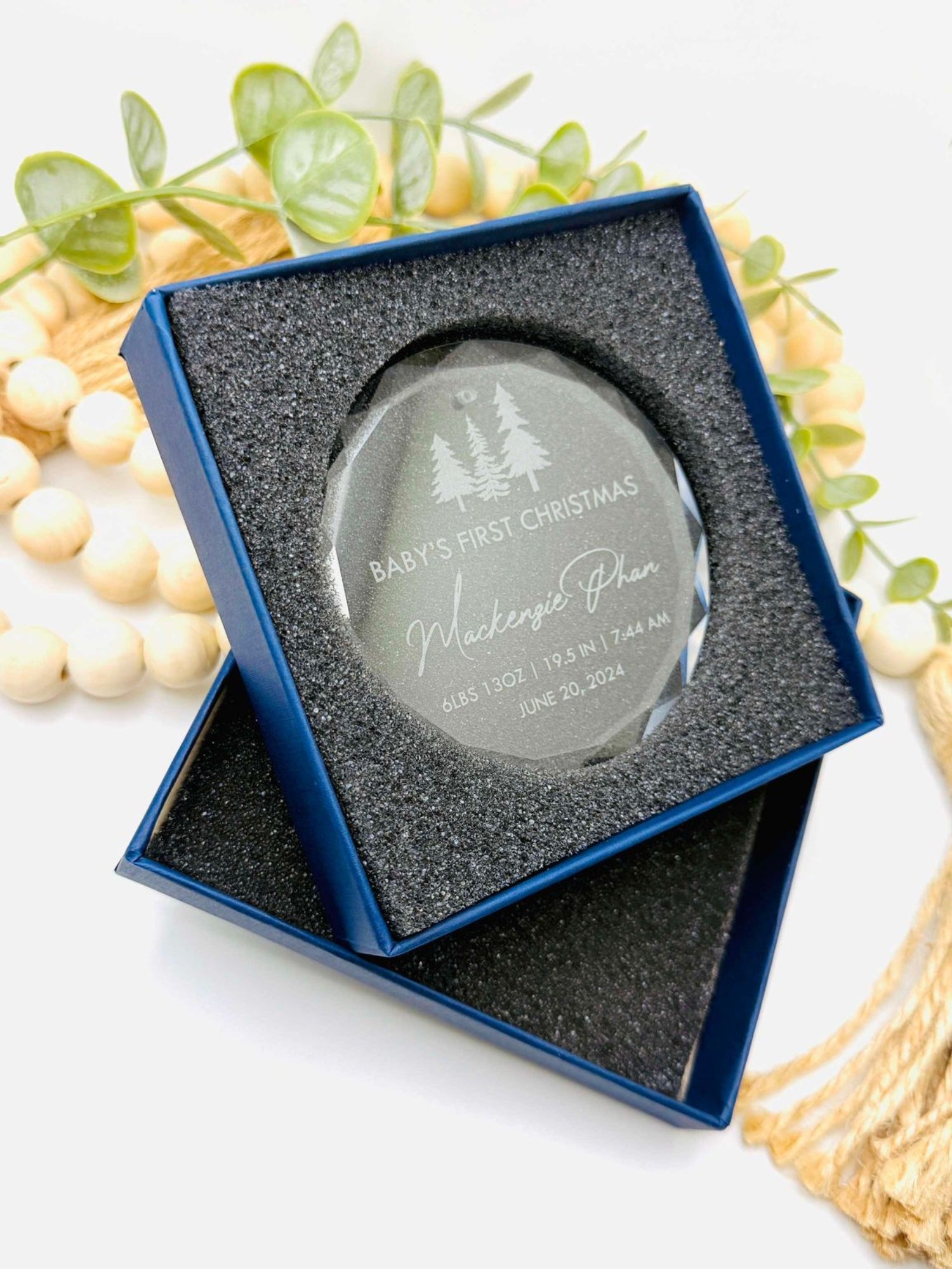 Capture the magic of your baby's first Christmas with this beautifully personalized glass ornament—a keepsake to treasure for years to come. Expertly laser-engraved with your baby’s name, birth weight, length, and the exact date and time of their arrival, this ornament brings a truly special touch to your holiday décor. Simply fill in your custom details in the personalization box below, and let us create a heartwarming addition to your tree! Make this Christmas unforgettable with a timeless piece your family will cherish.