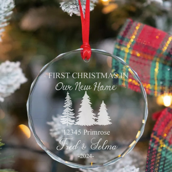 Capture the magic of your first year in your new home with this beautifully personalized glass ornament—a keepsake to treasure for years to come. Expertly laser-engraved with your address, name, and year! This ornament brings a truly special touch to your holiday décor. Simply fill in your custom details in the personalization box below, and let us create a heartwarming addition to your tree! Make this Christmas unforgettable with a timeless piece your family will cherish.