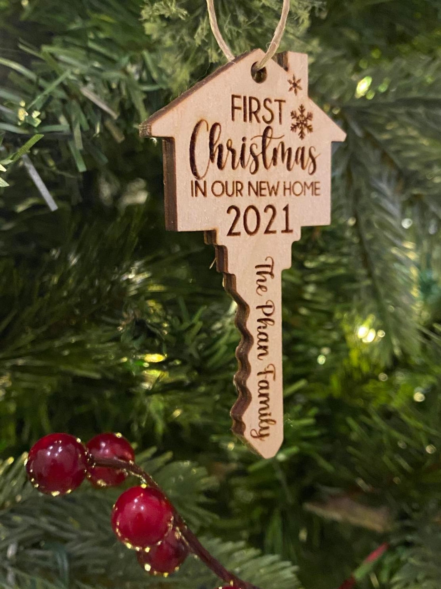 This charming wooden key-shaped ornament is designed to capture the joy, excitement, and fresh-start energy of moving into a new space. Thoughtfully crafted with laser-engraved details, it features a cozy house silhouette at the top, elegant holiday typography, and an optional family name to make it truly yours.