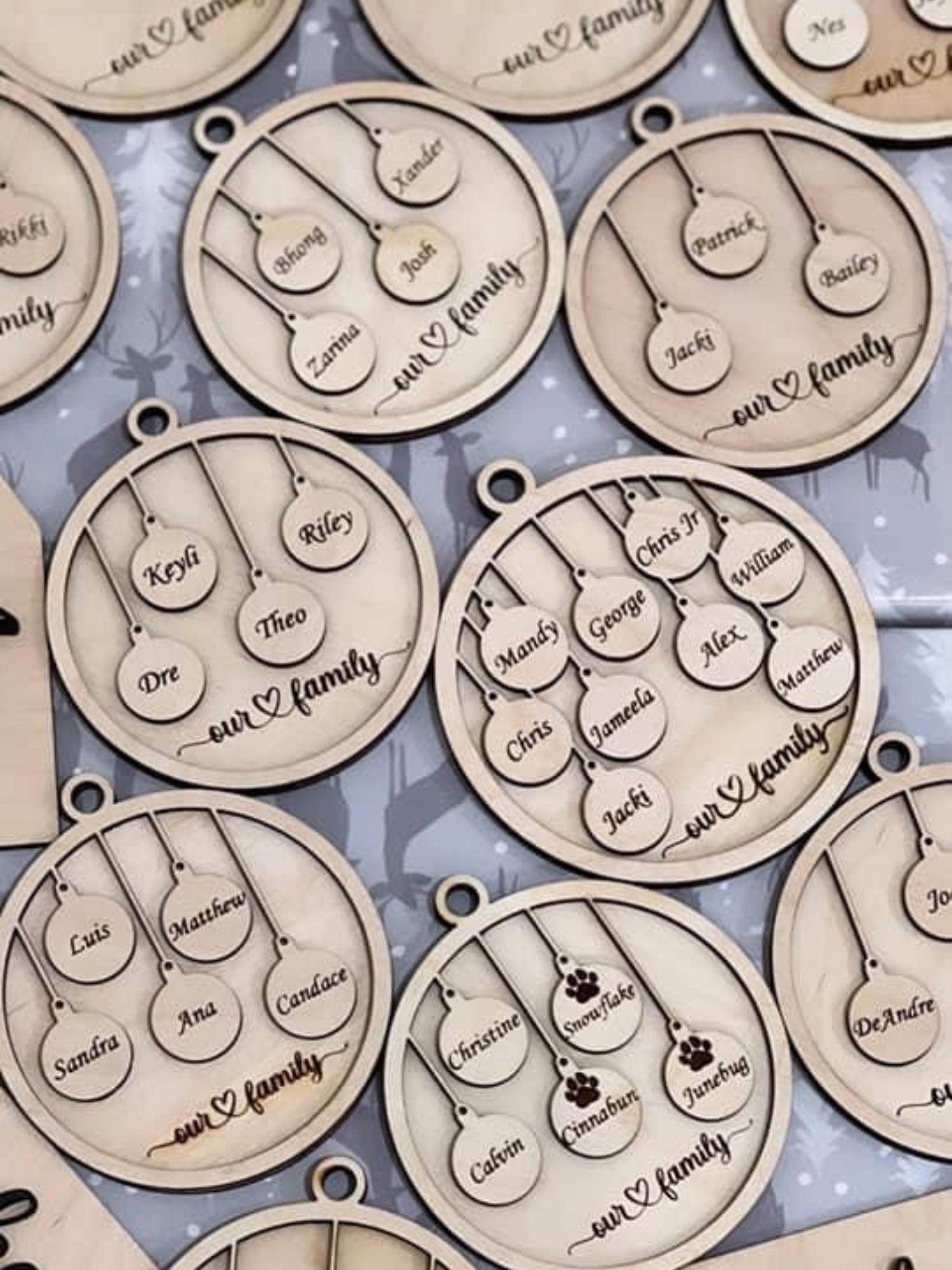 Celebrate the holiday with this unique wooden ornament to commemorate the year gone by. Engrave the names of all your family members, including your beloved pets, with adorable paw prints by their name.